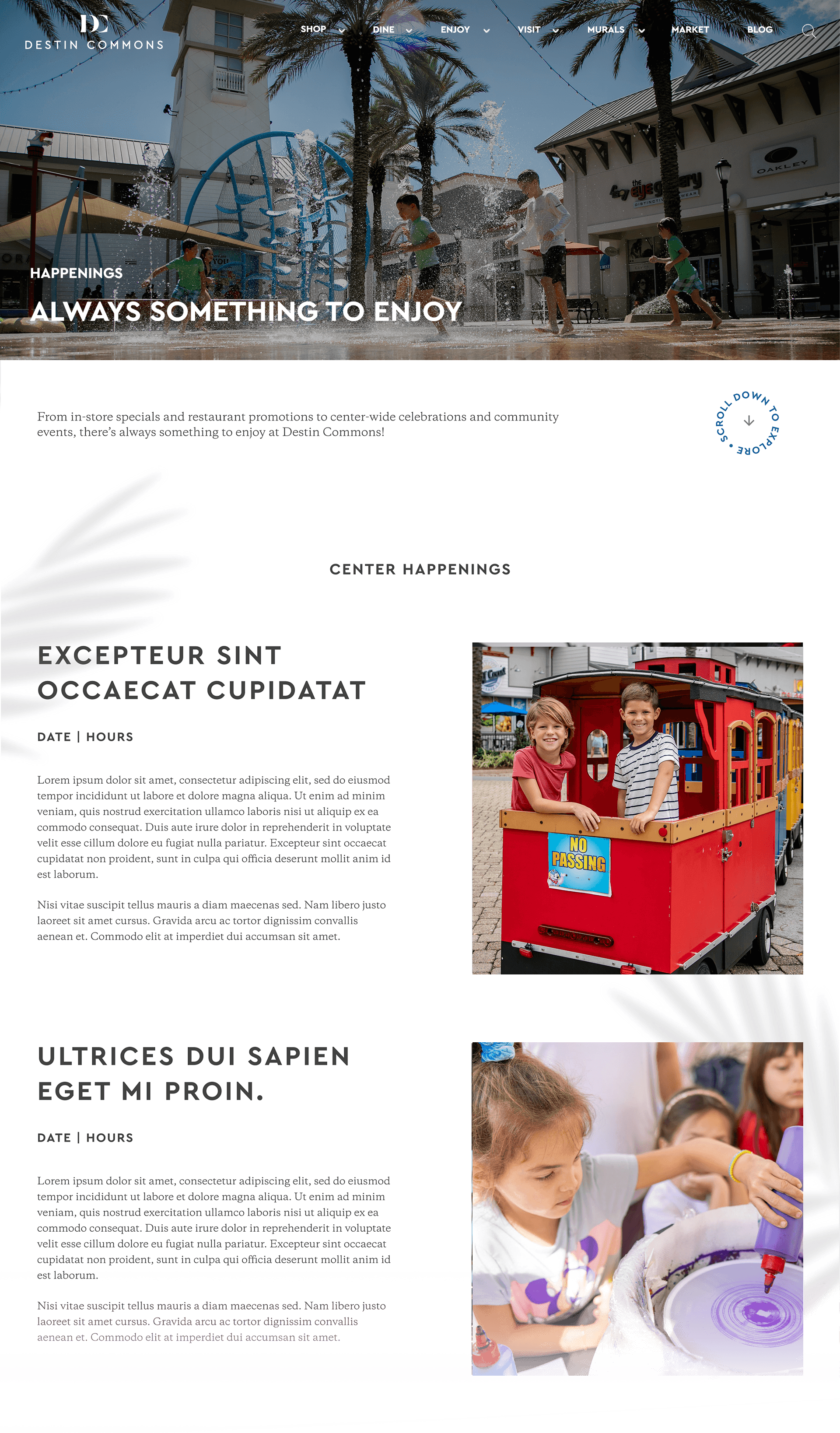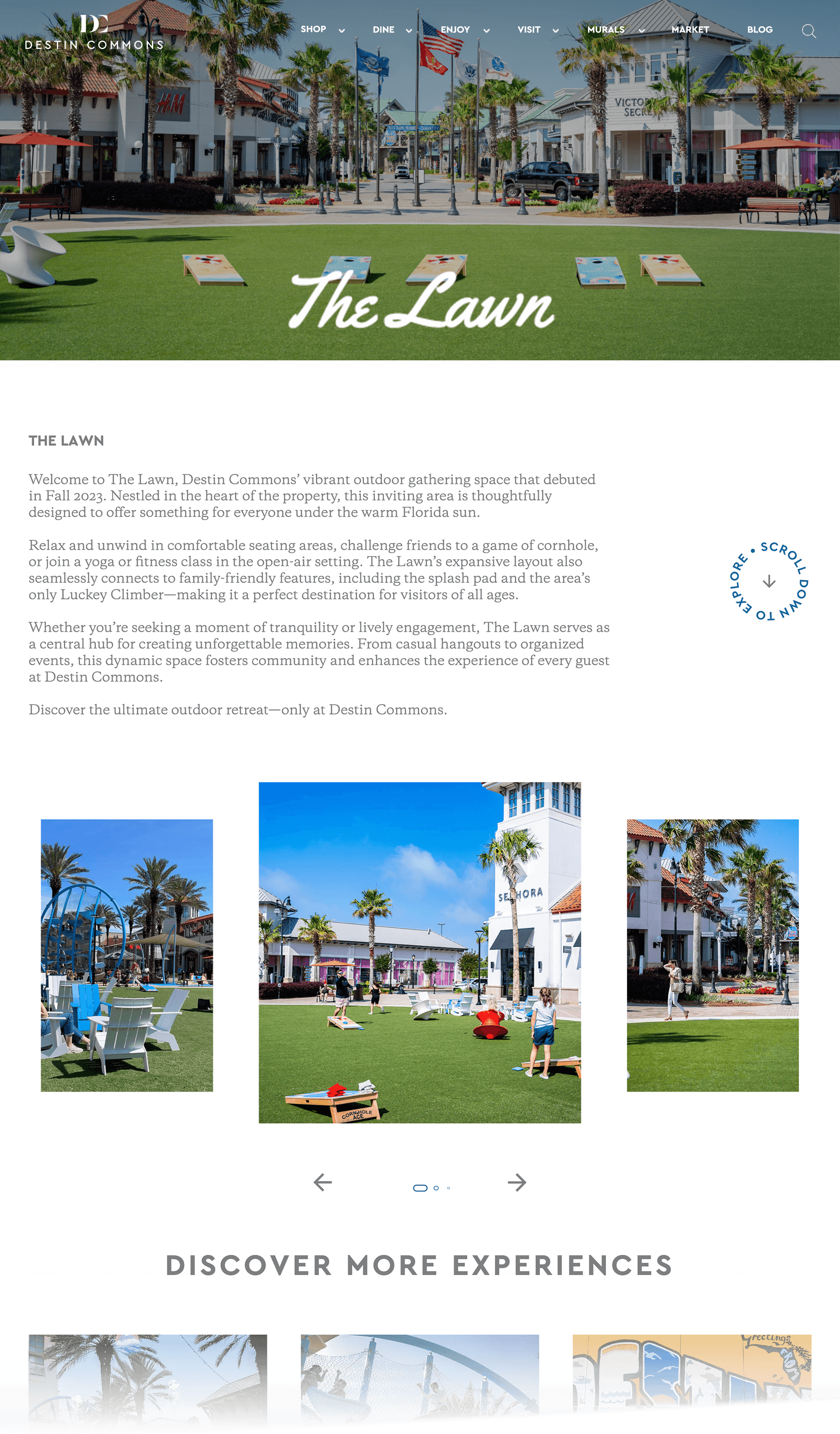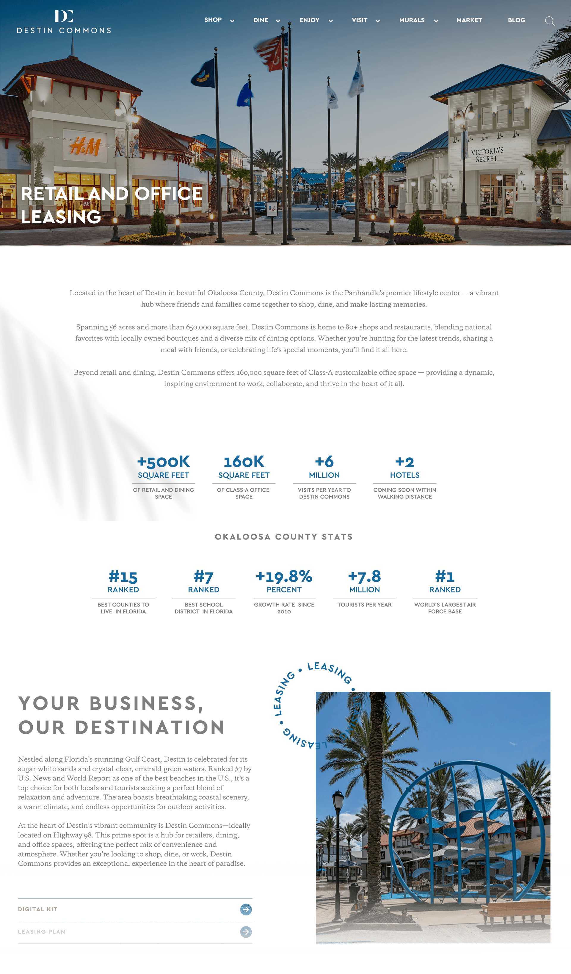 I designed the Destin Commons homepage to clearly showcase its dining, shopping, and entertainment offerings in a clean, streamlined layout that’s easy to navigate and visually engaging.