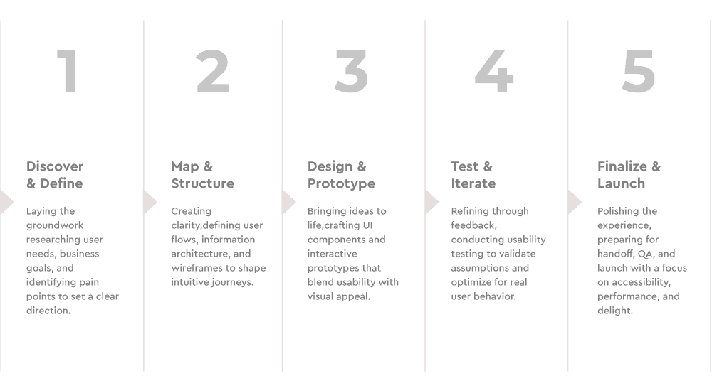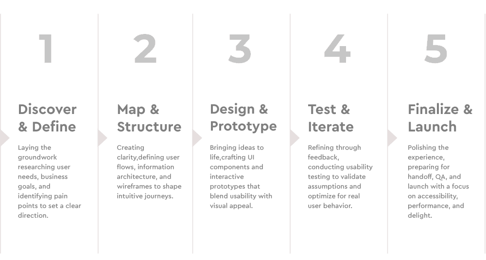 Sitemap, Surveys, Styles, Components, Wireframes, High-Fidelity Mock-ups, User Journey Mapping, Prototypes, Usability Tests and Findings, Video & Photography, Marketing Assets.