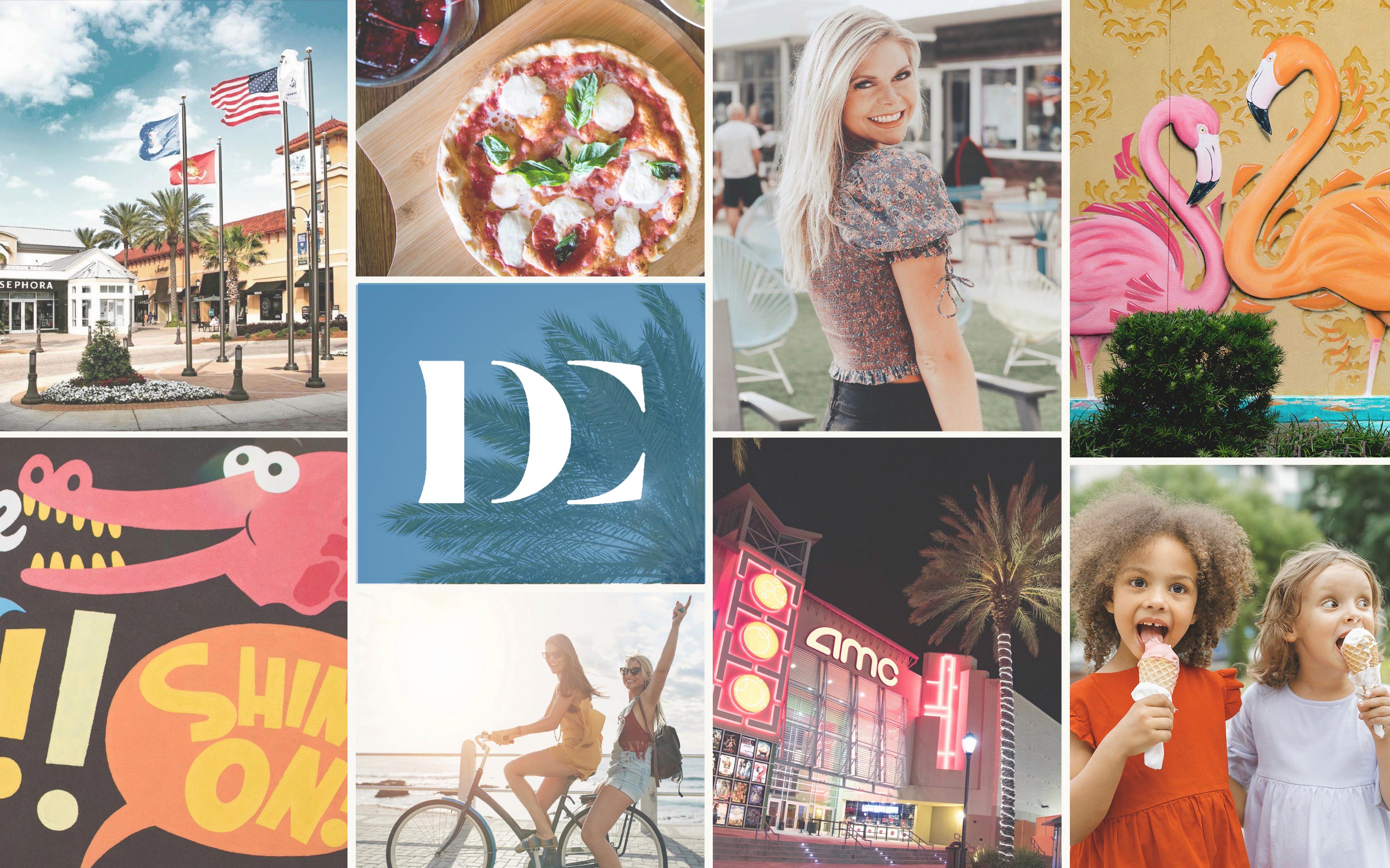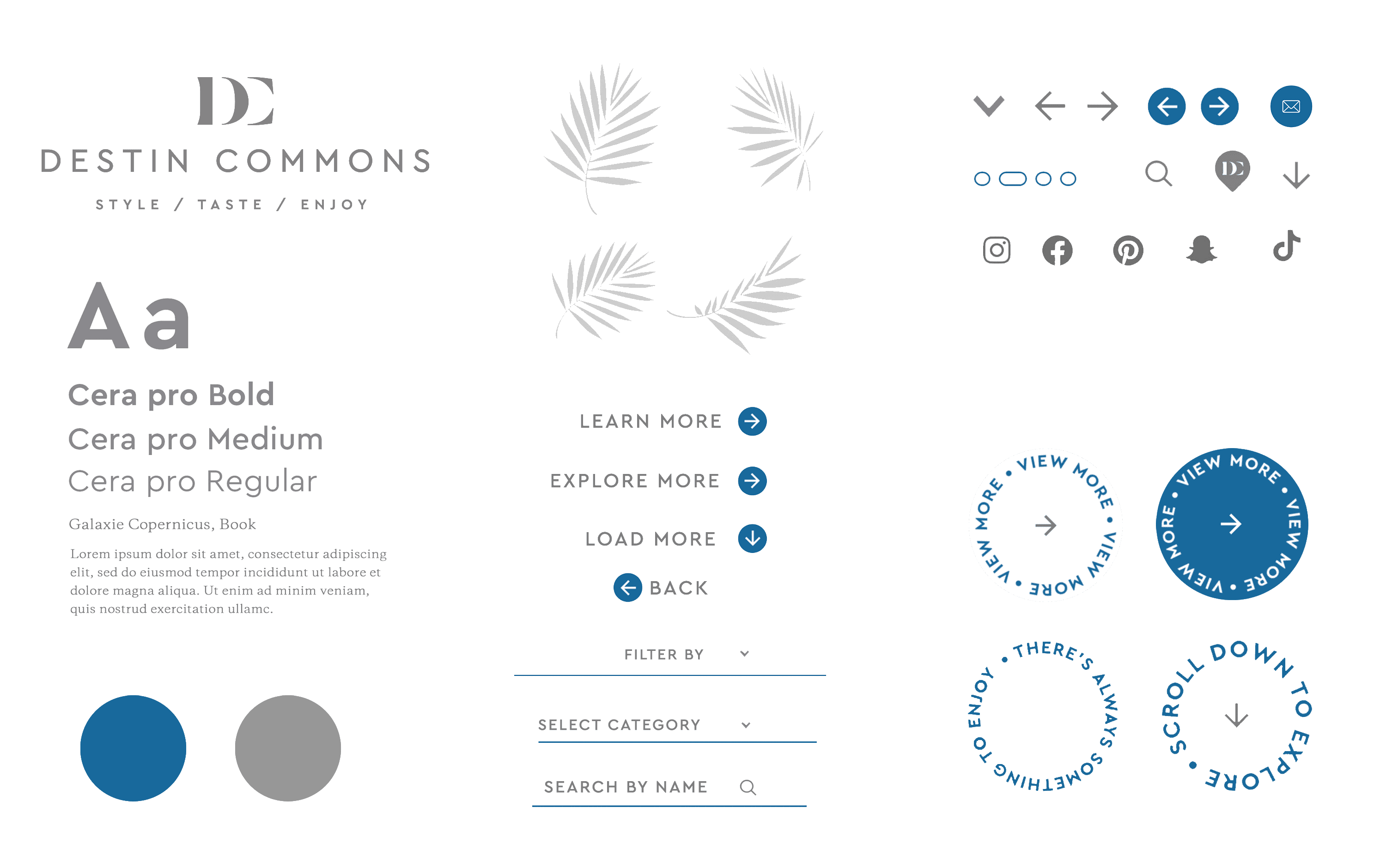 The brand identity for Destin Commons embodies the spirit of coastal living, showcasing its charm as a vibrant yet laid-back, family-friendly destination. The color palette is inspired by coastal landscapes symbolizing its welcoming atmosphere.