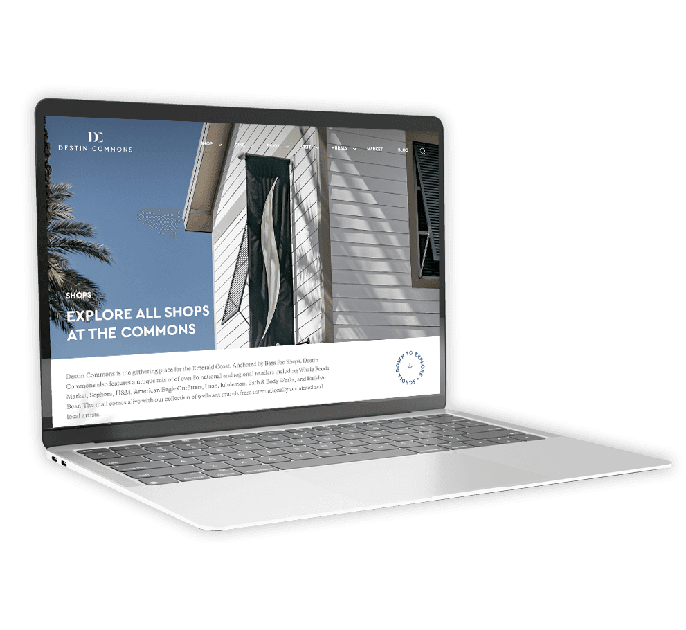 The objective was to design a fully custom, user-centered website that simplifies navigation, drives traffic, boosts engagement, and improves user retention, while visually reflecting Destin Commons’ coastal vibe and highlighting its unique shopping, dining, and entertainment experiences.