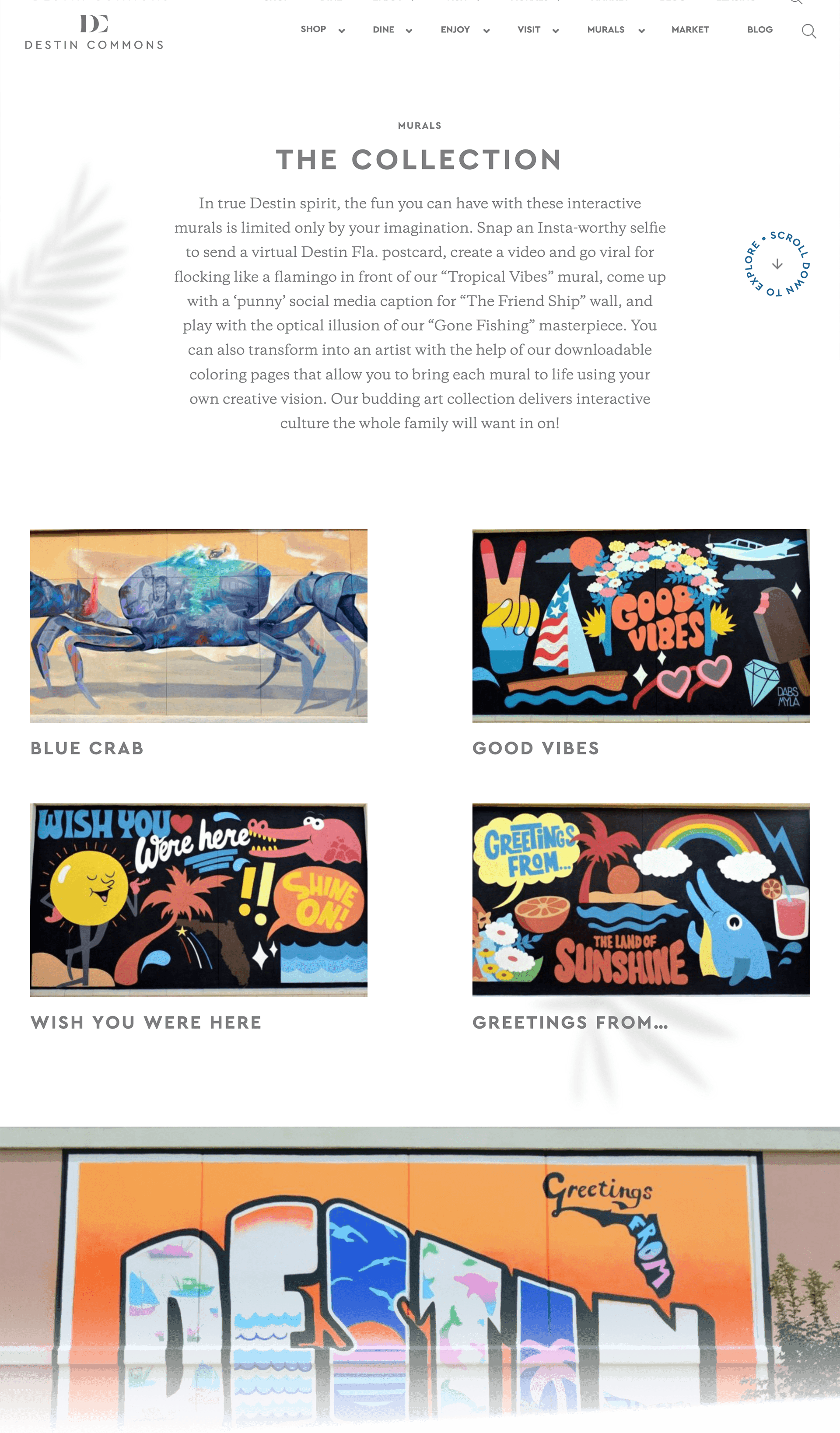 Destin Commons features a variety of engaging experiences designed to enrich every visit. Among them is a vibrant collection of murals by both local and national artists, curated as part of the center’s art and cultural program. To extend this experience beyond the physical space, I created a virtual art tour—bringing the mural collection to life online and allowing website visitors to explore the artwork from anywhere.
