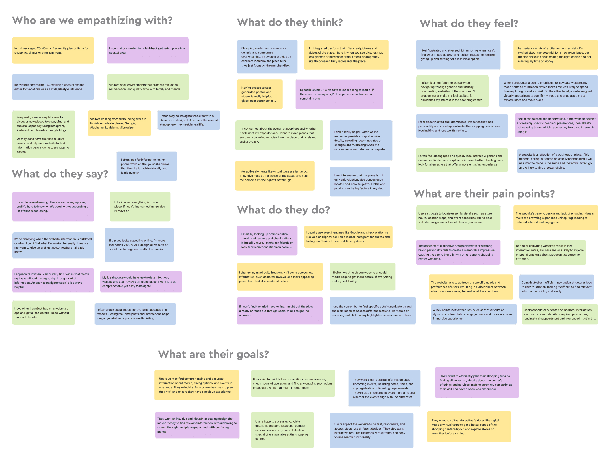 I conducted interviews and distributed a survey to gather shoppers' insights about how they decide where to shop, dine, and find entertainment. The research focused on understanding their preferences, habits, pain points and goals when planning their outings as well as the importance of easily finding this information online to make informed choices.