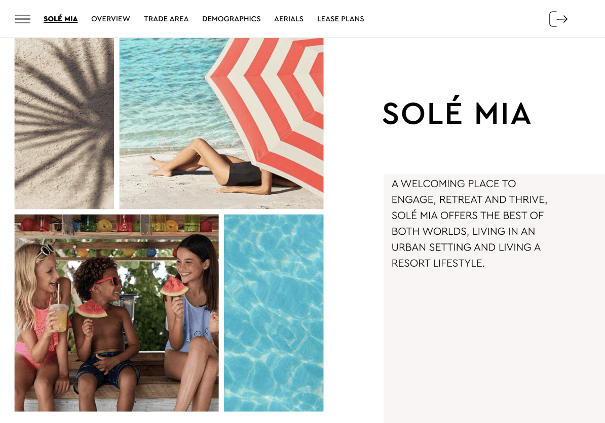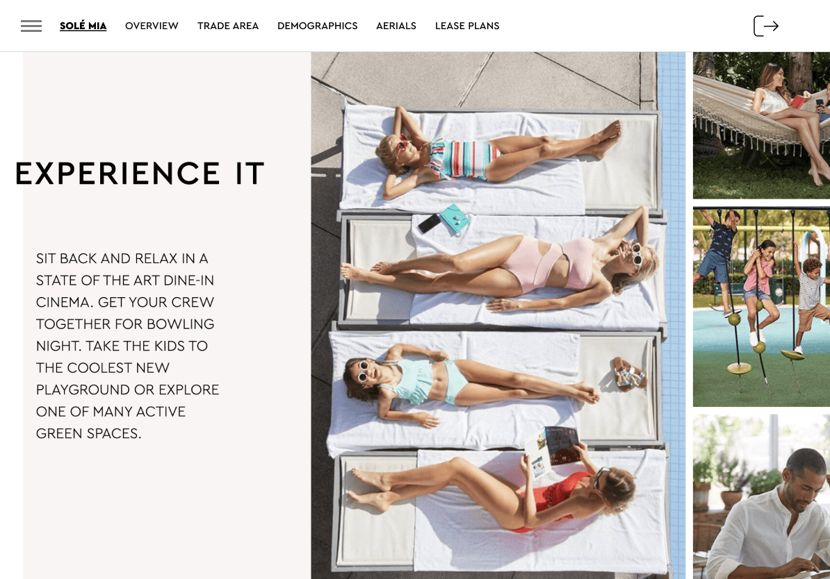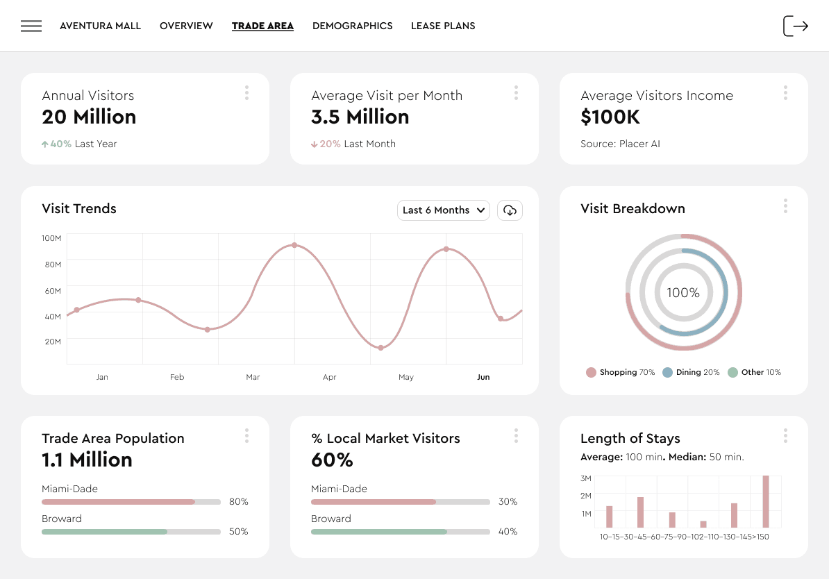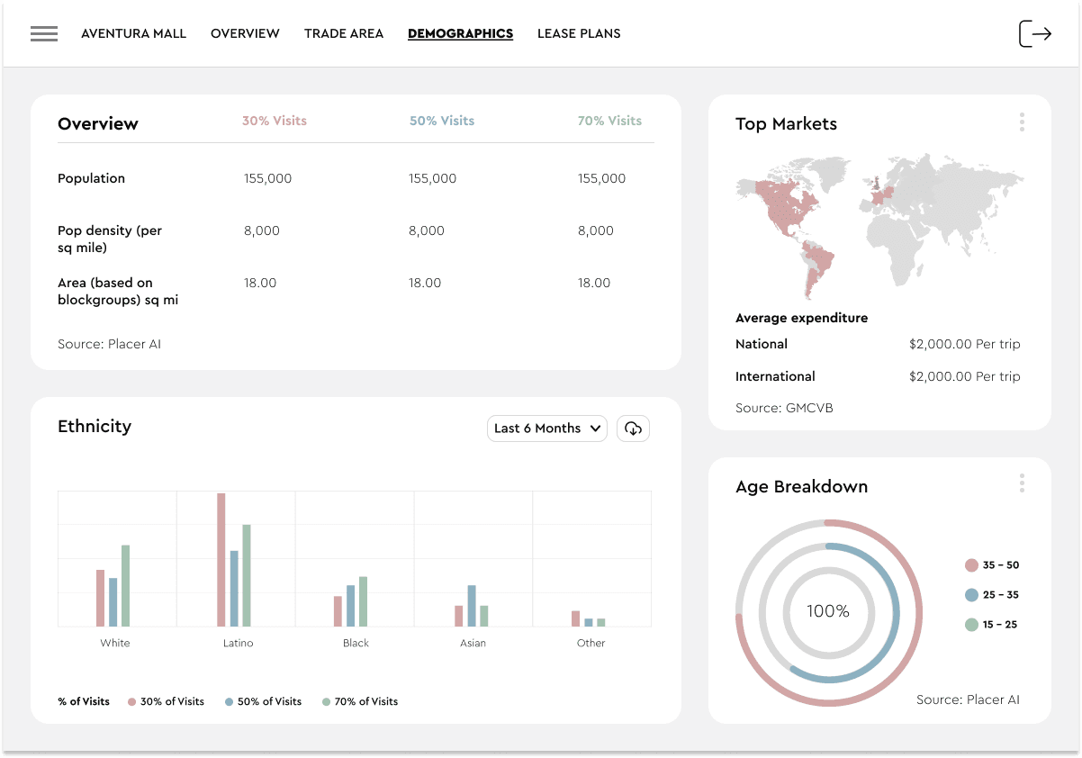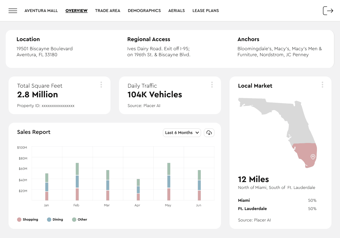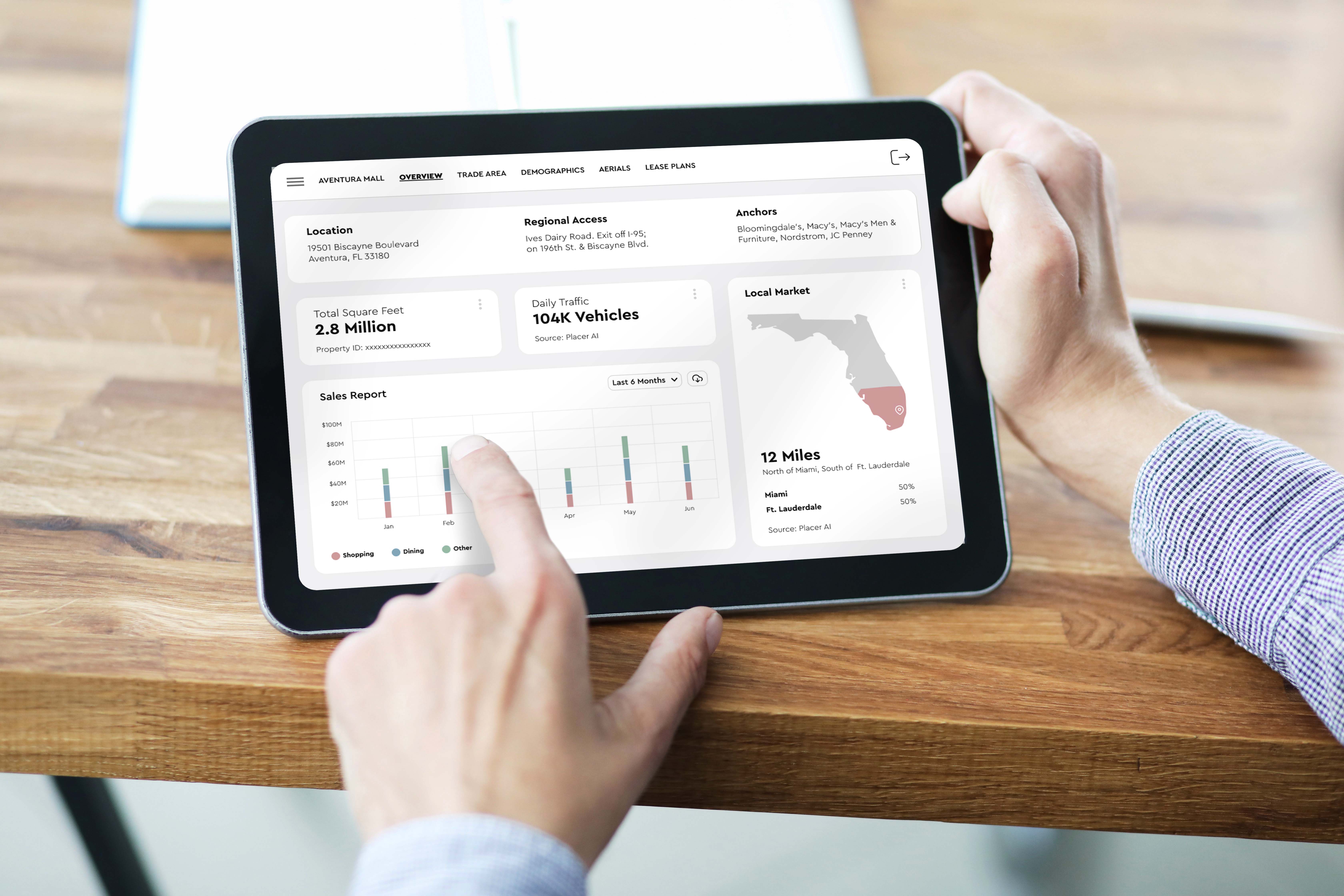 This tool provides real-time, up-to-date insights on each retail property, including demographics, traffic patterns, and local and international market data, all through a seamless, user-friendly interface featuring fully customizable graphics, maps, and design elements.