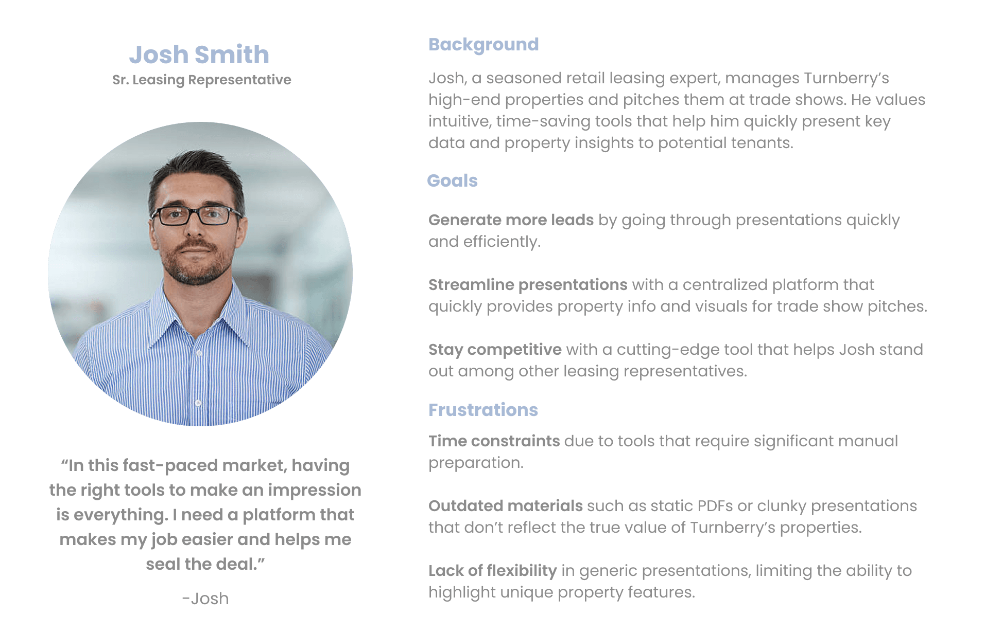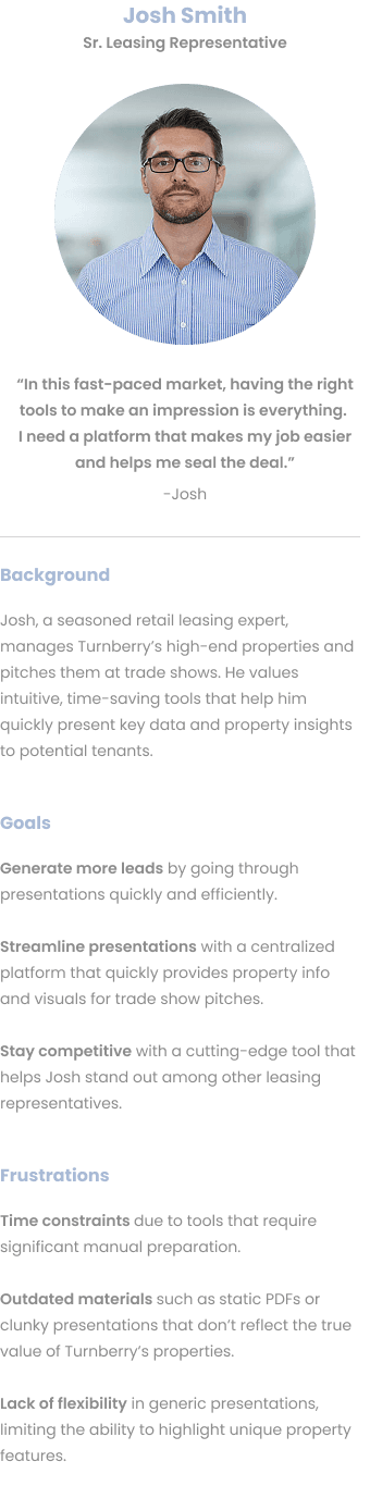 Through multiple discussions with the Leasing Team, the primary users of the platform, I gained valuable insights into their needs. This enabled me to create user personas and develop a platform tailored to their requirements.
